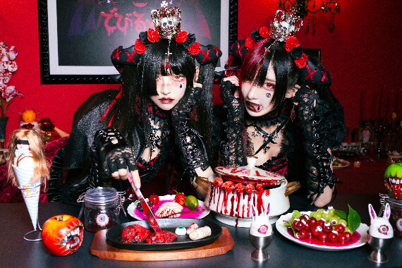 漆黒の赤薔薇の中に咲き誇るスカルクラウンと、ツインテールも可愛く絡みつく編み上げリボン